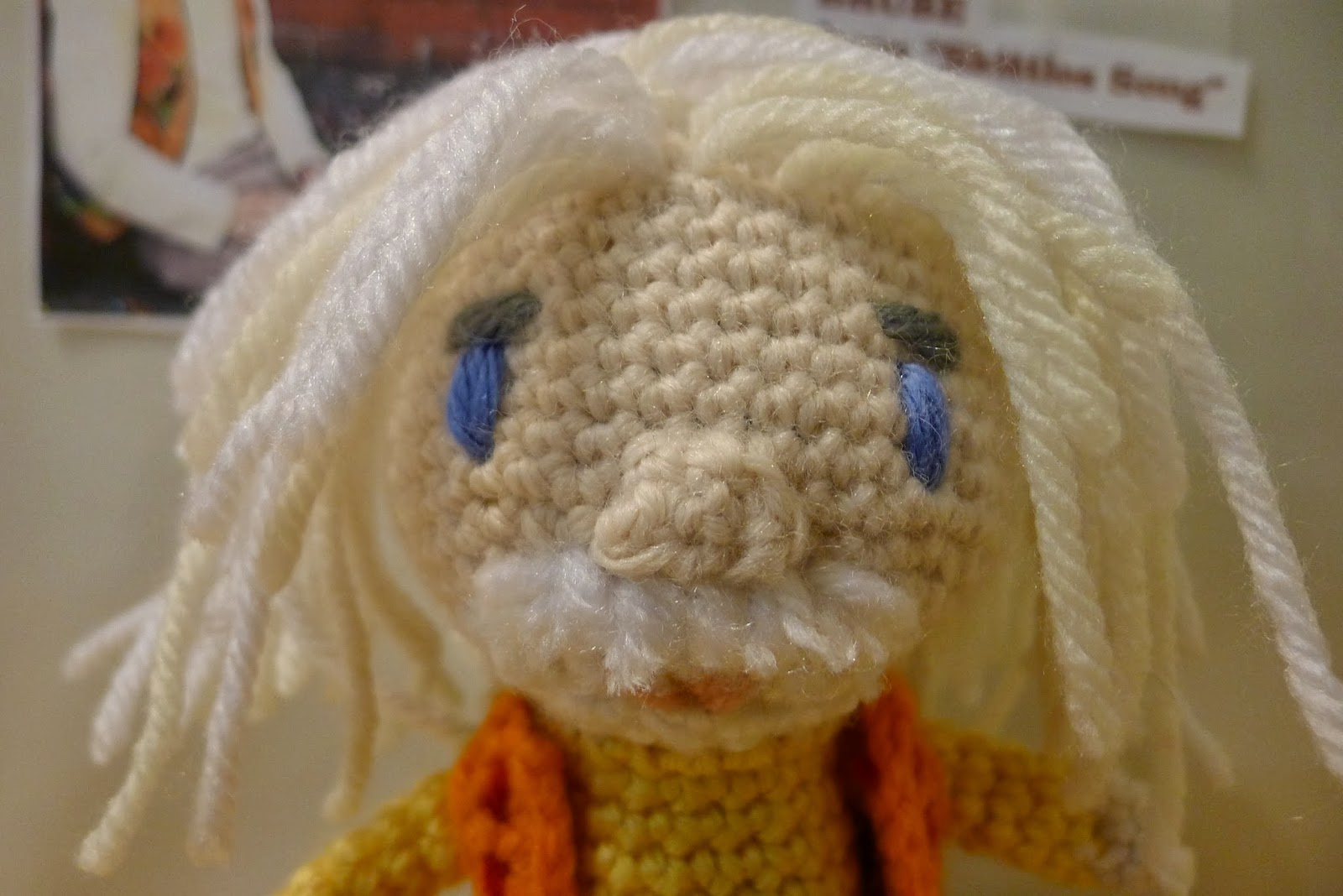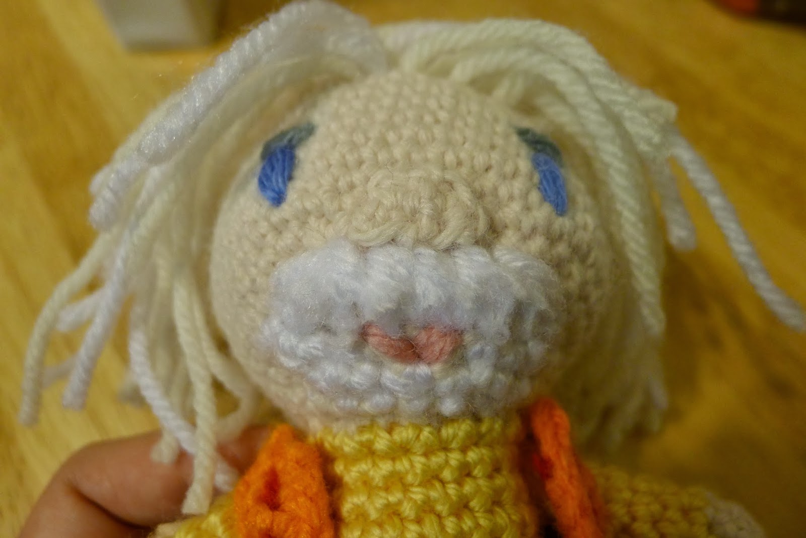 Fasten off and leave a long long long tail to attach it to your head.  When I attached it to my head, I whip stiched mine twice in each stitch in order to form a thick turtleneck at the top of his shirt.