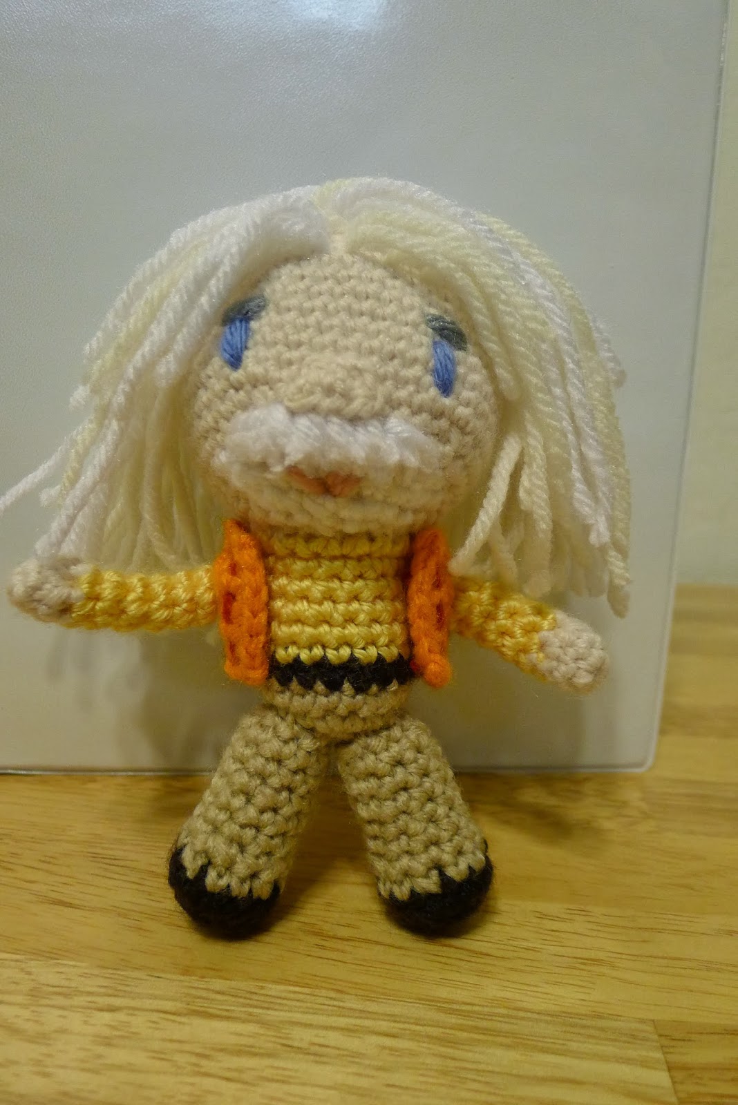 Rnd 22: SC in next 3 sts, sc2tog, repeat around (20 SC) Begin Stuffing head. Stitch a few strands above your mouth to create a mustache, I clipped half the thread (not all the way through) to create prickly pieces to stand out like a real mustache, and then added a bit of glue to the end to prevent splitting.   Then I created a nose (ch 4, SC in 2nd ch from hook and the next 2, ch 1, turn, sc across all 3 sts, fasten off with a tail and sew onto your face above the mustache)