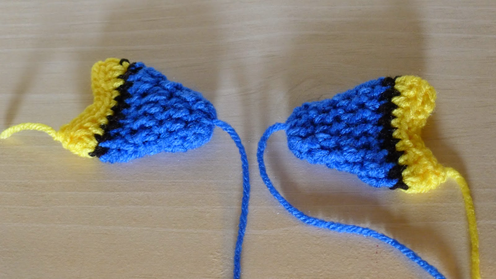 These are only approx sizes, basically just do a row of SC in blue, and a row in black to the size you like to create the fin!